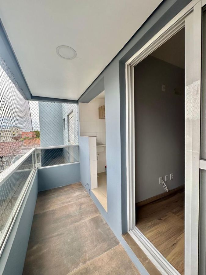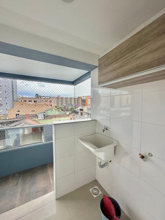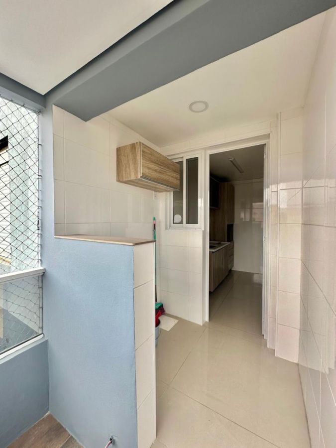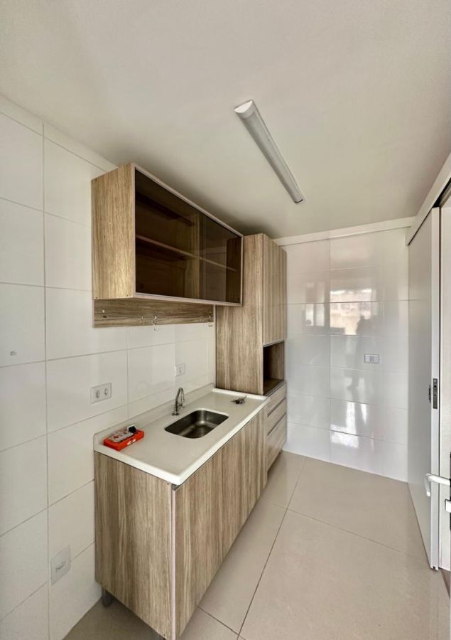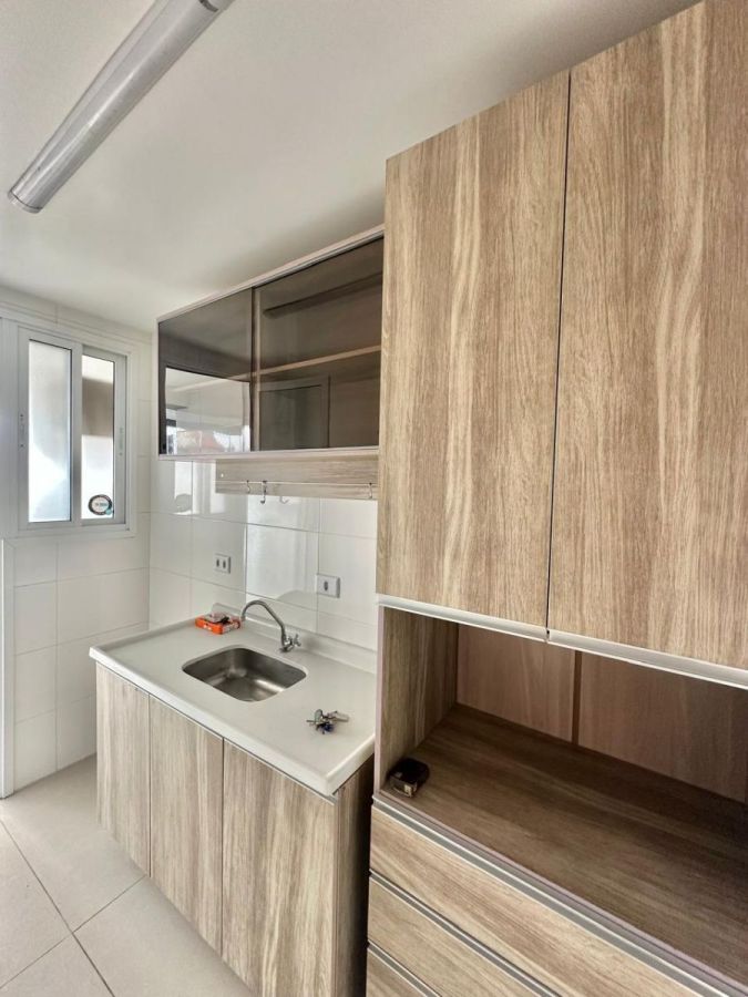 Possui sala de estar, cozinha, área de serviço, um dormitório, banheiro completo, sacada com churrasqueira e vaga de garagem privativa.