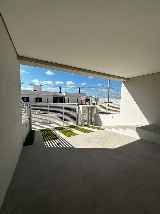 No pavimento térreo possui sala de estar, sala de jantar e cozinha integrados, lavabo, lavanderia, garagem para 2 carros e pátio.