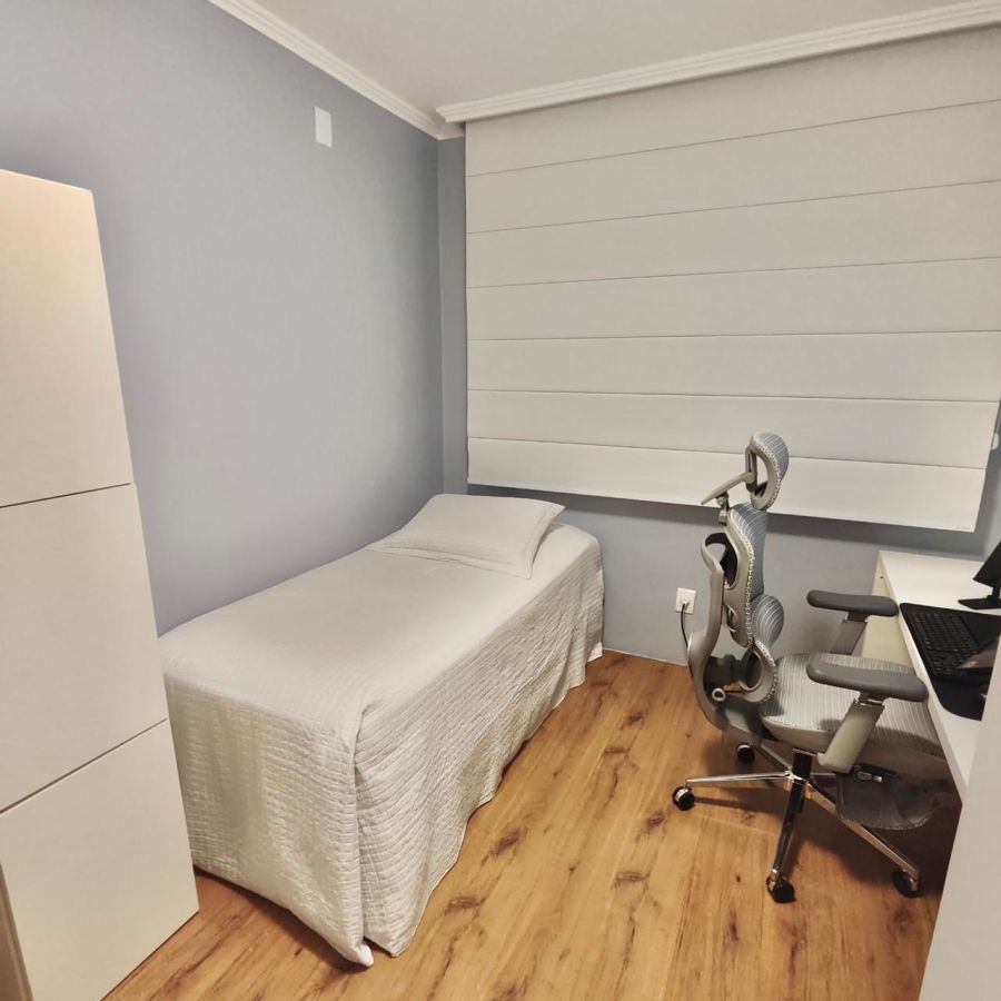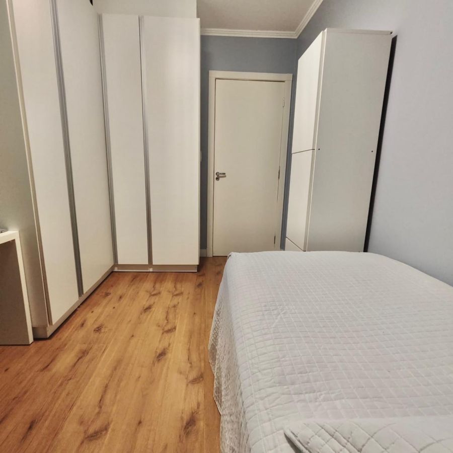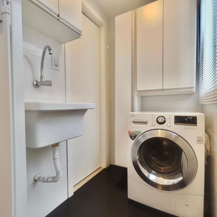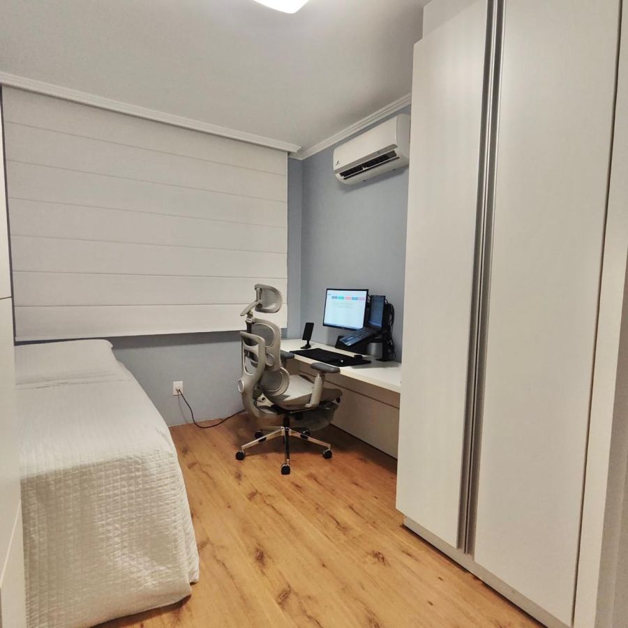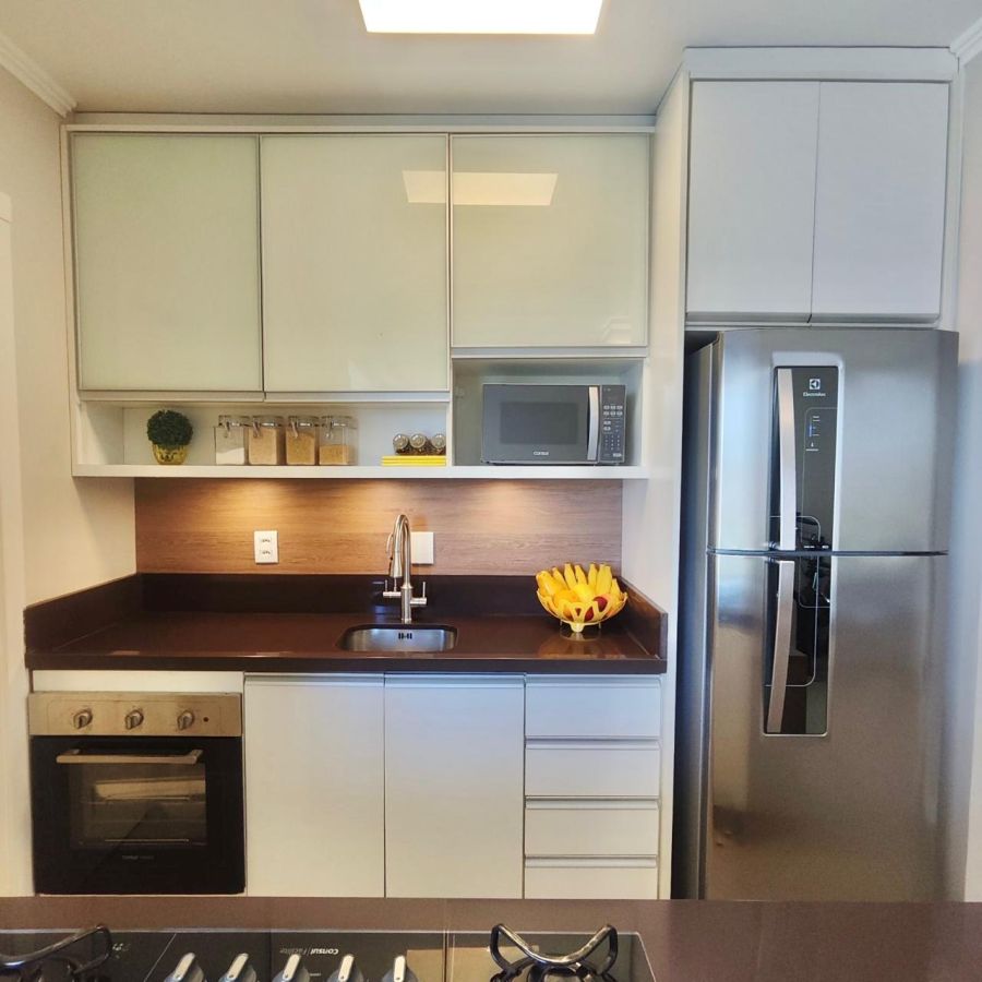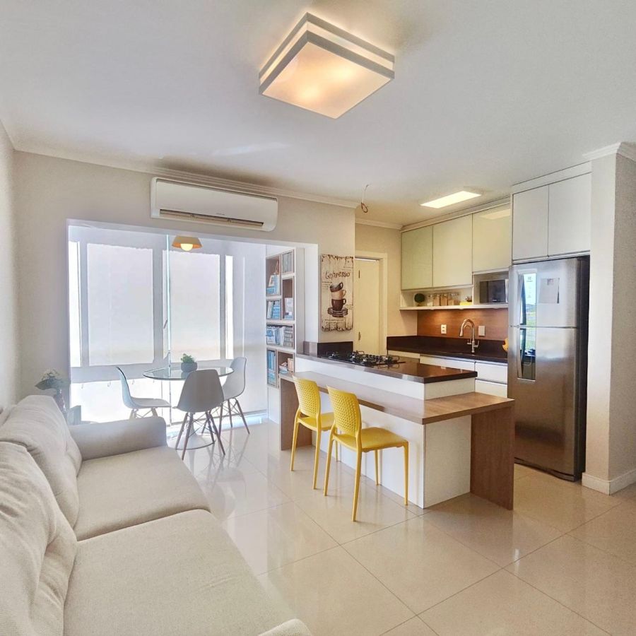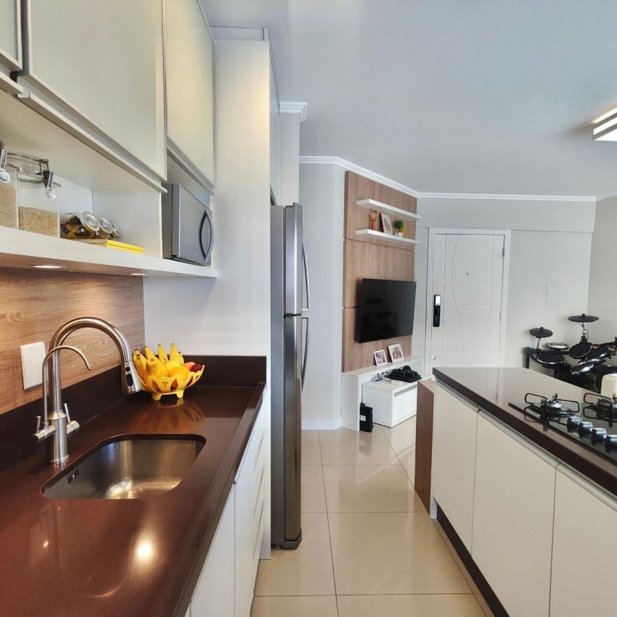 Possui sala de estar com sacada fechada integrada, cozinha americana, área de serviço, banheiro, 2 dormitórios e banheiro social, além de vaga de garagem fechada.
